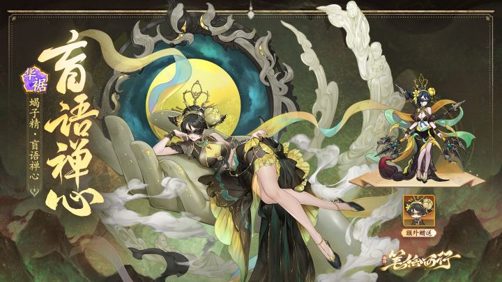 【活动时间】11/8 7:00 - 12/20 6:59【活动说明】活动期间,书灵大人可通过完成通行证任务提升其等级,获得丰厚奖励。解锁「行者之传」并达到30级可获得皮肤「蝎子精·盲语禅心」(获得新皮肤后,可在角色-皮肤界面查看和穿戴)及海量养成材料!解锁「释厄真传」更可获得通行证等级提升10级、限定专属表情包、仙玉及水盆羊肉! 流光墨绿绸缎覆身,黑纱眼罩缠绕添韵。倚卧佛手之上,嘴角轻