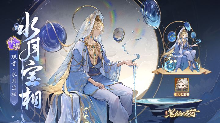 「观音·水月宝相」现已上线!【活动时间】8/30 7:00起常驻【活动说明】活动开启后,新皮肤「观音·水月宝相」将在孔雀商会-皮肤商店中上架并常驻售卖。
