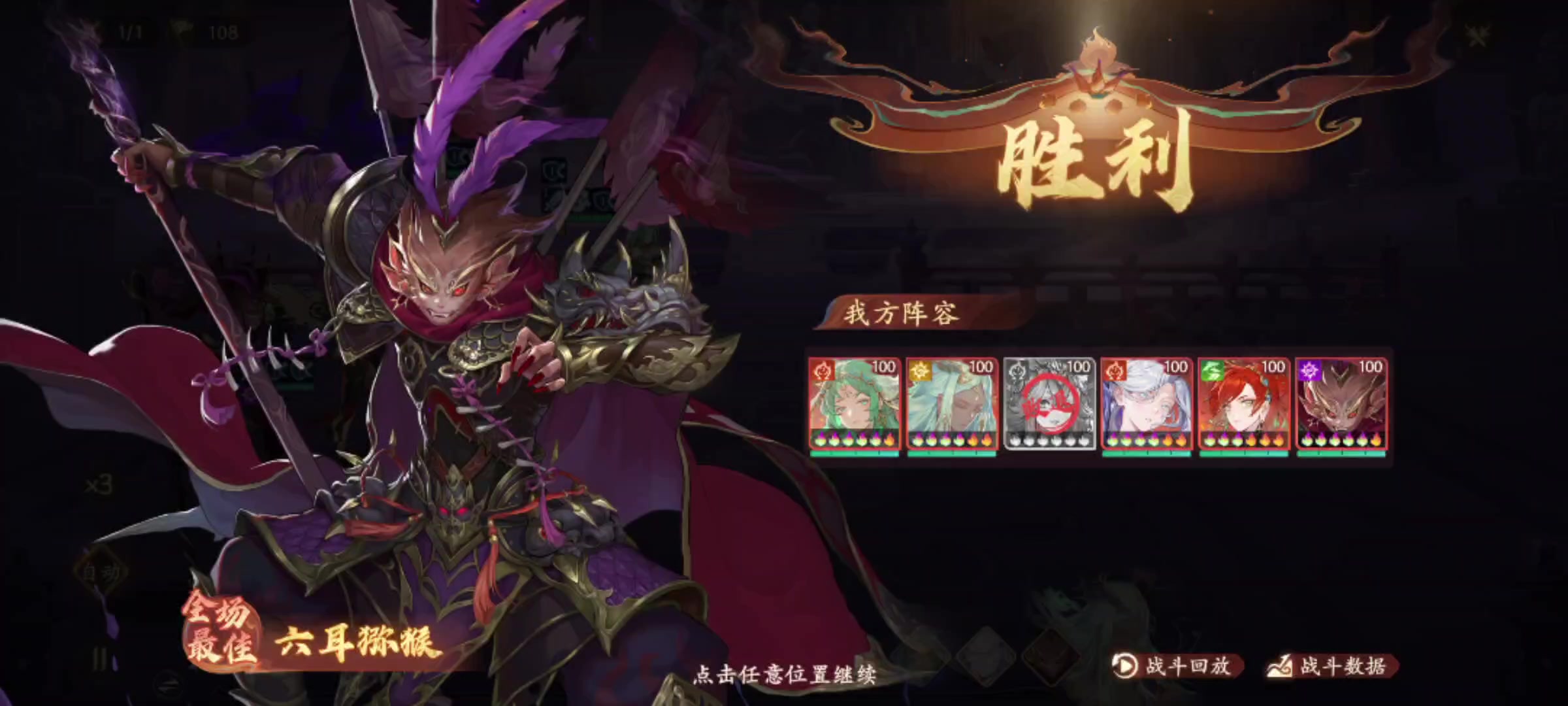 比较简单,按照视频里得来就行,嫦娥会先出手,黑猴子会获得隐身和加速,然后黑猴子3技能大土地,能把土地血量压得很低,然后哪吒放2技能嫦娥会触发被动,嫦娥动了会触发狗子被动A出来几层撕裂,然后直接狗子回合,狗子开大直接打前排会干掉土地,然后哪吒3技能大嫦娥,接着大圣3技能打嫦娥会有个追击又会刷新狗子回合,然后狗子A一下嫦娥就死了,然后就赢了。。。如果哪一个回合跟我说的不一样有可能就是没暴击,按照这个打