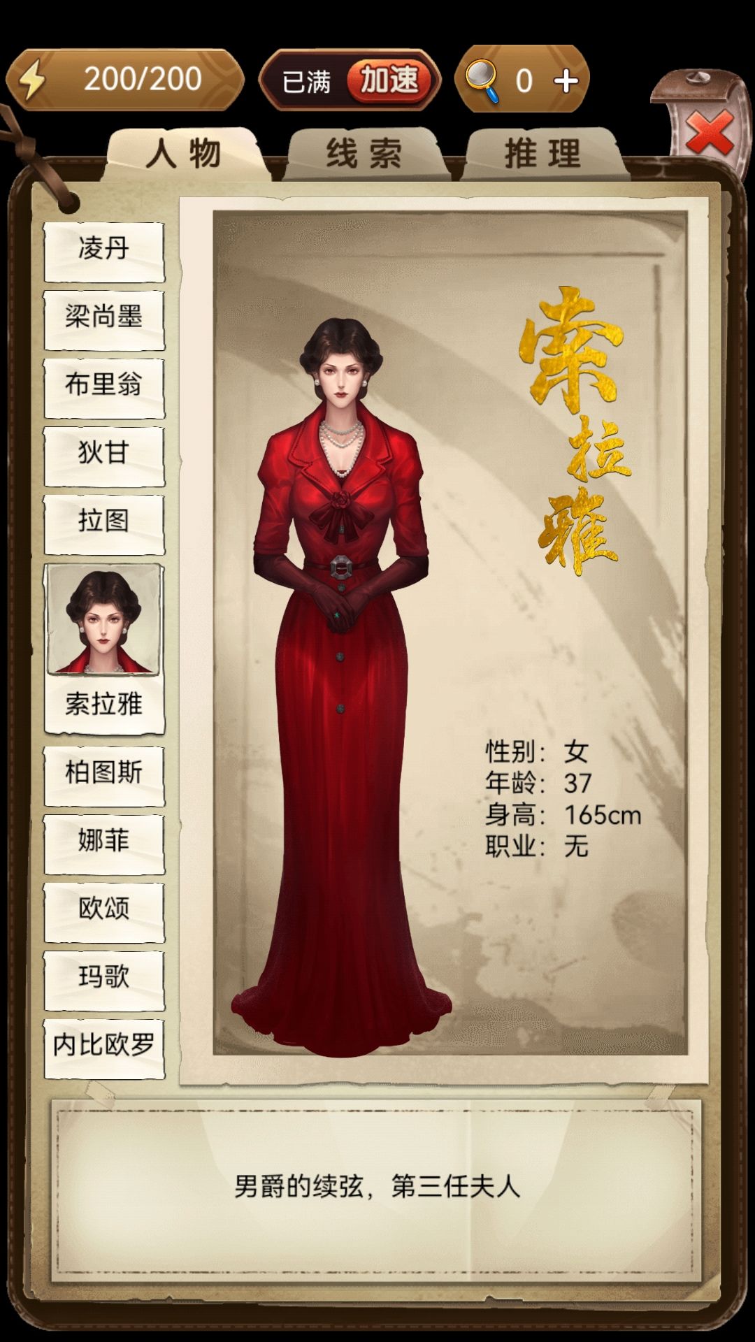 第九章 推论 1.男爵的罪证 两张旧船票 2.凶器是 手杖 3.与怪盗相关的线索 纸签 4.谁搬运了干尸 玛歌 5.搬运干尸的工具 手推车 6.玛歌去过密道的证明 铜盆 7.毒杀男爵的凶手 娜菲 8.娜菲是凶手的证据 茶花女 9.柏图斯见过男爵的证明 半支烟 10.内比欧罗的身份 保险调查员 (更多游戏攻略请关注微信公众号:黄小戈的魔法盒子)
