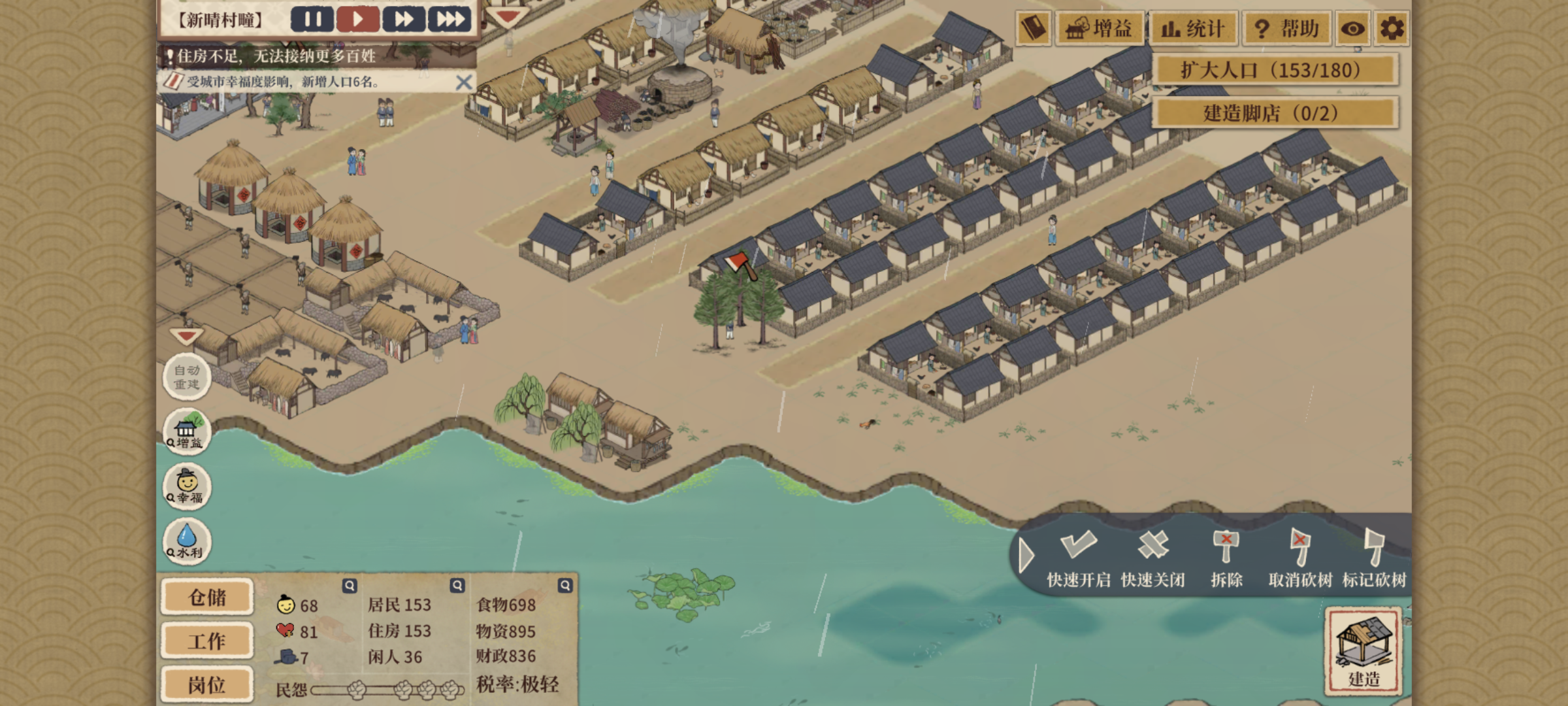 在前期我们需要造田,以农为本,尽量挑选肥沃的土地种植,同时也需要建樵采,采石场,粘土场,。在入口突破50人后需要规划下加工区,商业区,并建造养猪场,鱼户。例如碳场,铁匠铺,并建造养猪场,民窑并在旁边放置市井建筑脚工,这个可以给这3个加工的增益,也很重要,之后在建市井建筑茶坊,茶坊是十分重要的建筑,尽量把它放置在你农业区的中间,它可以增加范围内农作物的产量,用道路连接茶坊,后续用石子路蒲路的时候,茶坊可以吃到增益buff,带来更多的营收。另外说一下不要急于求成,一下全部建完,要保证有闲人足够的时候,有的建筑会有维护费,这样会让我们白白亏钱,在100人左右就要着手建造酒坊,咸菜坊,和面粉坊,记得大力发展农业,因为酒坊咸菜坊面粉坊都很耗费粮食。同时可以建造住房建筑农舍了,在闲人足够的时候在建造集市,客店,集市时常会有可以交易的选项,你可以根据个人情况决定是都买卖,另外提一嘴,集市和客店很容易有罪犯,建造一个牢狱即可,建在商业区旁,可以随时把这些刁民抓住😋。把这些弄完,就要考虑建造文化里的学塾,开始准备研究了,我自己建议先把增加产量点出来,后面的就随便,你想把重税点出来的话,我建议你在准备实行重税之前先把招贤庄做了,招贤庄300人解锁,因为重税会掉很多幸福度,较重是掉25,极重40,招一些幕僚,不要让幸福度掉的太狠了。下一阶段就是500人了,再进入这个阶段的途中把百工该建的建筑都建了,房子在300人后就可以建瓦房了,推荐把房屋材料减少的研究点出来再建,因为要钱,可以建造酒楼了,把鱼肆建一下,有需要的,并准备铺石子路,将所有市井建筑连接起来,吃到增益。另外提一下文化的道观和佛寺,这个都随意的,但是我都建一个,把他们放商业区进点尤其是佛寺,这两个建筑都可以降低范围内的犯罪,但是他们减犯罪的效果不会叠加,后期最少建3个。在这个阶段多建几个学塾没事,把研究冲一下。,600人还是500人可以解锁市舶司,可以正式开始海外贸易了(有的剧情模式不可以建),贸易推荐把高丽和三齐佛给找出来,把这两个的贸易等级拉高,尤其是三齐佛的,他的船的设计图纸一定要换,满级船是900很能装,自己的船满级才350,买肉菜麦子都可以来三齐佛,买来的肉还可以去高丽卖,高丽高价收,钱少可以这样。在800人后把寻找原石的造4,5个造玉坊1个和制作金簪子4个吧的造出来,解锁燕歌酒楼放在商业区那里,这时候你的研究都点差不多了吧,没有也没关系,不是很依赖,慢慢点就是,有钱了把幕僚换成好的,加旅游人数,农业产量的,幸福度的,减民怨的。把重税,令户合租,二次加工,地下赌场都弄了,后面就不缺钱了,等到1500了就可以解锁奇观了,有要求声望的,声望通过官窑,豪宅还有收集些奢侈品建造的好像是博物观提升。