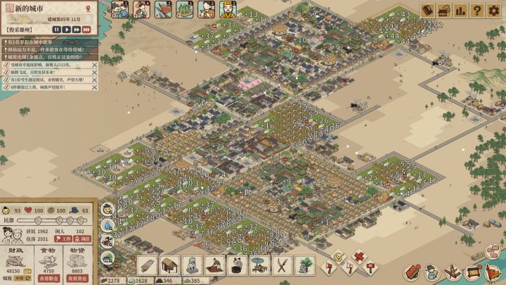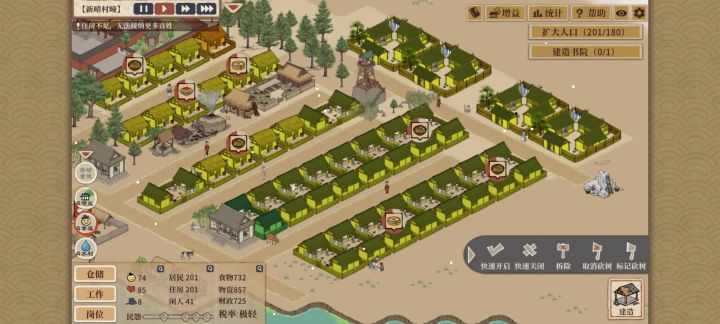 在前期我们需要造田,以农为本,尽量挑选肥沃的土地种植,同时也需要建樵采,采石场,粘土场,。在入口突破50人后需要规划下加工区,商业区,并建造养猪场,鱼户。例如碳场,铁匠铺,并建造养猪场,民窑并在旁边放置市井建筑脚工,这个可以给这3个加工的增益,也很重要,之后在建市井建筑茶坊,茶坊是十分重要的建筑,尽量把它放置在你农业区的中间,它可以增加范围内农作物的产量,用道路连接茶坊,后续用石子路蒲路的时候,茶坊可以吃到增益buff,带来更多的营收。另外说一下不要急于求成,一下全部建完,要保证有闲人足够的时候,有的建筑会有维护费,这样会让我们白白亏钱,在100人左右就要着手建造酒坊,咸菜坊,和面粉坊,记得大力发展农业,因为酒坊咸菜坊面粉坊都很耗费粮食。同时可以建造住房建筑农舍了,在闲人足够的时候在建造集市,客店,集市时常会有可以交易的选项,你可以根据个人情况决定是都买卖,另外提一嘴,集市和客店很容易有罪犯,建造一个牢狱即可,建在商业区旁,可以随时把这些刁民抓住😋。把这些弄完,就要考虑建造文化里的学塾,开始准备研究了,我自己建议先把增加产量点出来,后面的就随便,你想把重税点出来的话,我建议你在准备实行重税之前先把招贤庄做了,招贤庄300人解锁,因为重税会掉很多幸福度,较重是掉25,极重40,招一些幕僚,不要让幸福度掉的太狠了。下一阶段就是500人了,再进入这个阶段的途中把百工该建的建筑都建了,房子在300人后就可以建瓦房了,推荐把房屋材料减少的研究点出来再建,因为要钱,可以建造酒楼了,把鱼肆建一下,有需要的,并准备铺石子路,将所有市井建筑连接起来,吃到增益。另外提一下文化的道观和佛寺,这个都随意的,但是我都建一个,把他们放商业区进点尤其是佛寺,这两个建筑都可以降低范围内的犯罪,但是他们减犯罪的效果不会叠加,后期最少建3个。在这个阶段多建几个学塾没事,把研究冲一下。,600人还是500人可以解锁市舶司,可以正式开始海外贸易了(有的剧情模式不可以建),贸易推荐把高丽和三齐佛给找出来,把这两个的贸易等级拉高,尤其是三齐佛的,他的船的设计图纸一定要换,满级船是900很能装,自己的船满级才350,买肉菜麦子都可以来三齐佛,买来的肉还可以去高丽卖,高丽高价收,钱少可以这样。在800人后把寻找原石的造4,5个造玉坊1个和制作金簪子4个吧的造出来,解锁燕歌酒楼放在商业区那里,这时候你的研究都点差不多了吧,没有也没关系,不是很依赖,慢慢点就是,有钱了把幕僚换成好的,加旅游人数,农业产量的,幸福度的,减民怨的。把重税,令户合租,二次加工,地下赌场都弄了,后面就不缺钱了,等到1500了就可以解锁奇观了,有要求声望的,声望通过官窑,豪宅还有收集些奢侈品建造的好像是博物观提升。