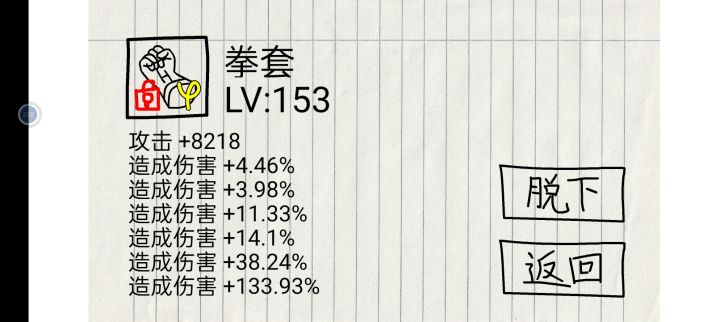 1-10的时候,boss属性相较小怪大幅提升,我们需要在1-9刷至十级,顺便攒钱。(先肘后拳巡回打出,穿插大招)十级以后,买出装备。(商店购买的装备随人物等级的提升而提升)我是直接刷出了B级拳套,补全了上衣,然后打穿了boss。(过关装备附图1)属性大致为99攻,51防,544血量的装备加成。