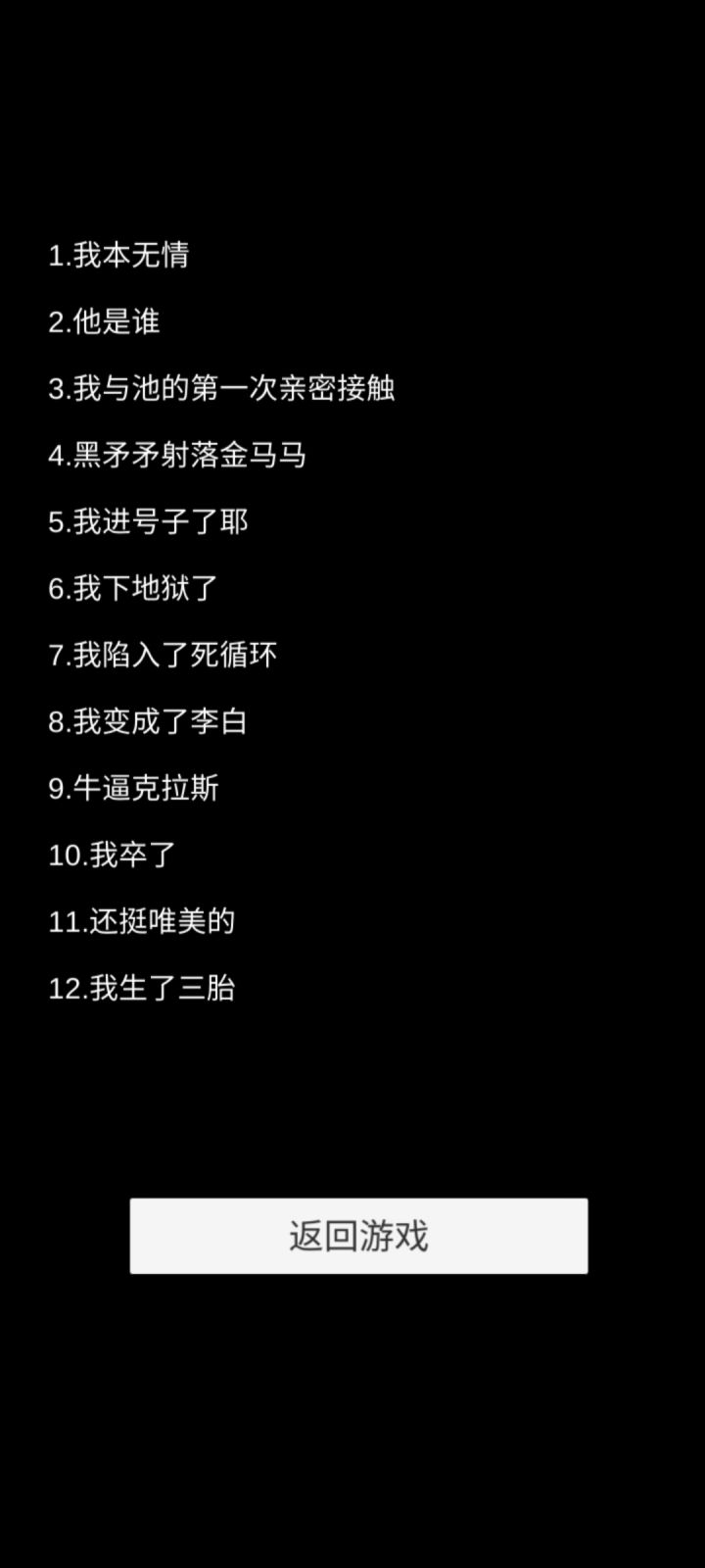 好吧,我真没想到我会玩这种游戏。但是静下心来找个安静的地方玩一下,还是不错的。第二个结局,嗯嗯,真是卖麻批啊,还好我有点心理准备。第十,还有第十一的结局,目前还没有达成。嗯,之前他那个上一款游戏,我也玩过,但是没有那么多耐心,就是玩了几个结局就没玩了,那个时候心情比较烦躁。但是自从我领悟人生之美好,世界之美妙。我终于把红尘俗世根给……………………