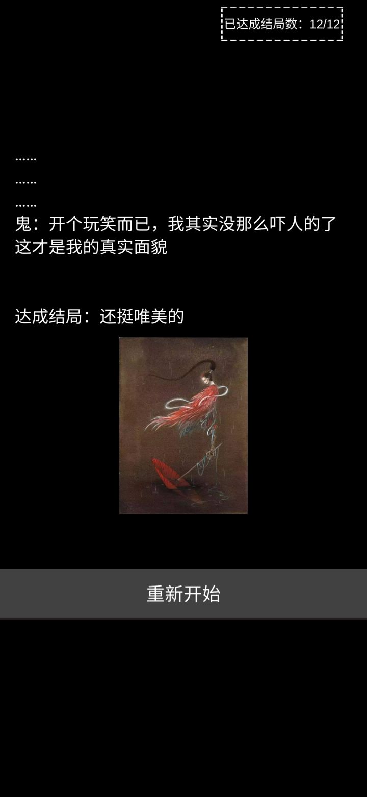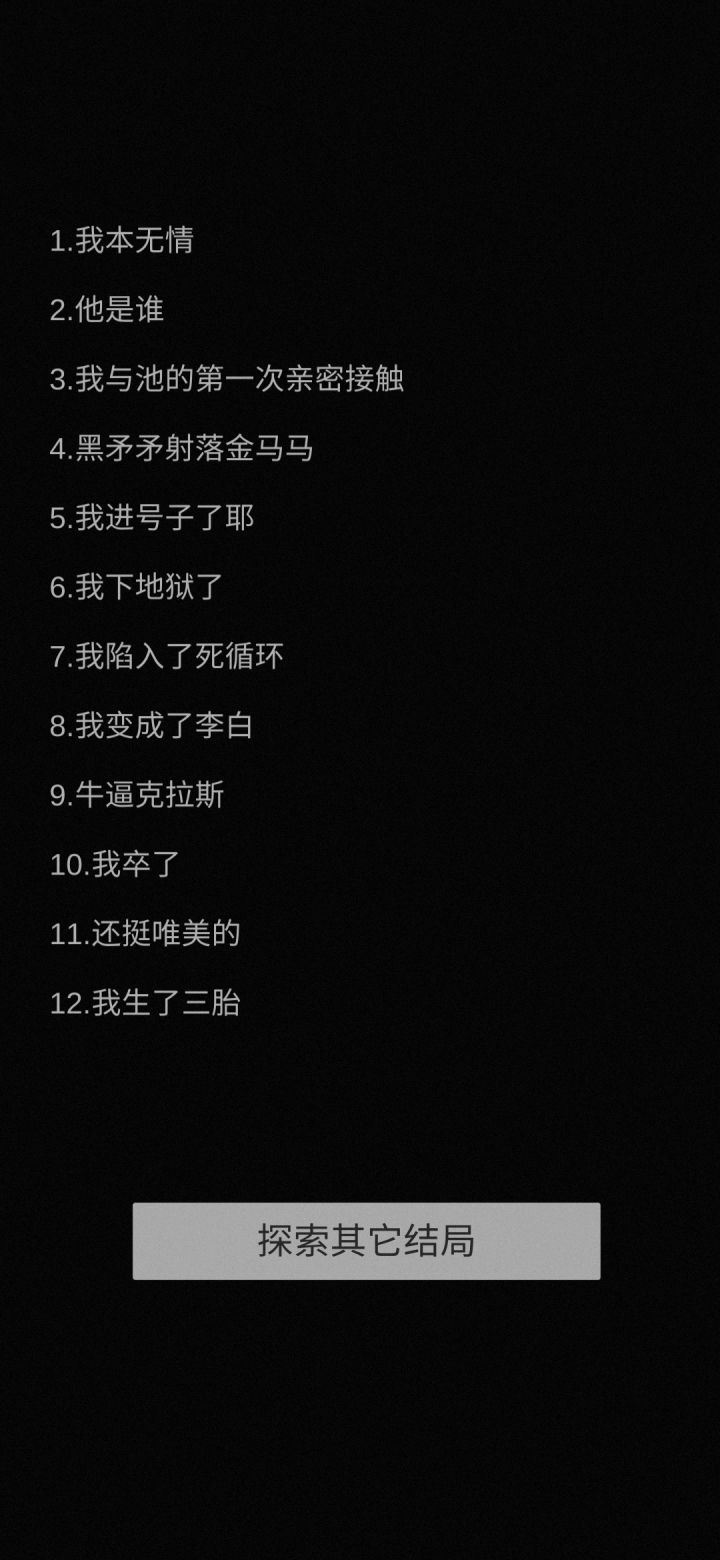 好吧,我真没想到我会玩这种游戏。但是静下心来找个安静的地方玩一下,还是不错的。第二个结局,嗯嗯,真是卖麻批啊,还好我有点心理准备。第十,还有第十一的结局,目前还没有达成。嗯,之前他那个上一款游戏,我也玩过,但是没有那么多耐心,就是玩了几个结局就没玩了,那个时候心情比较烦躁。但是自从我领悟人生之美好,世界之美妙。我终于把红尘俗世根给……………………