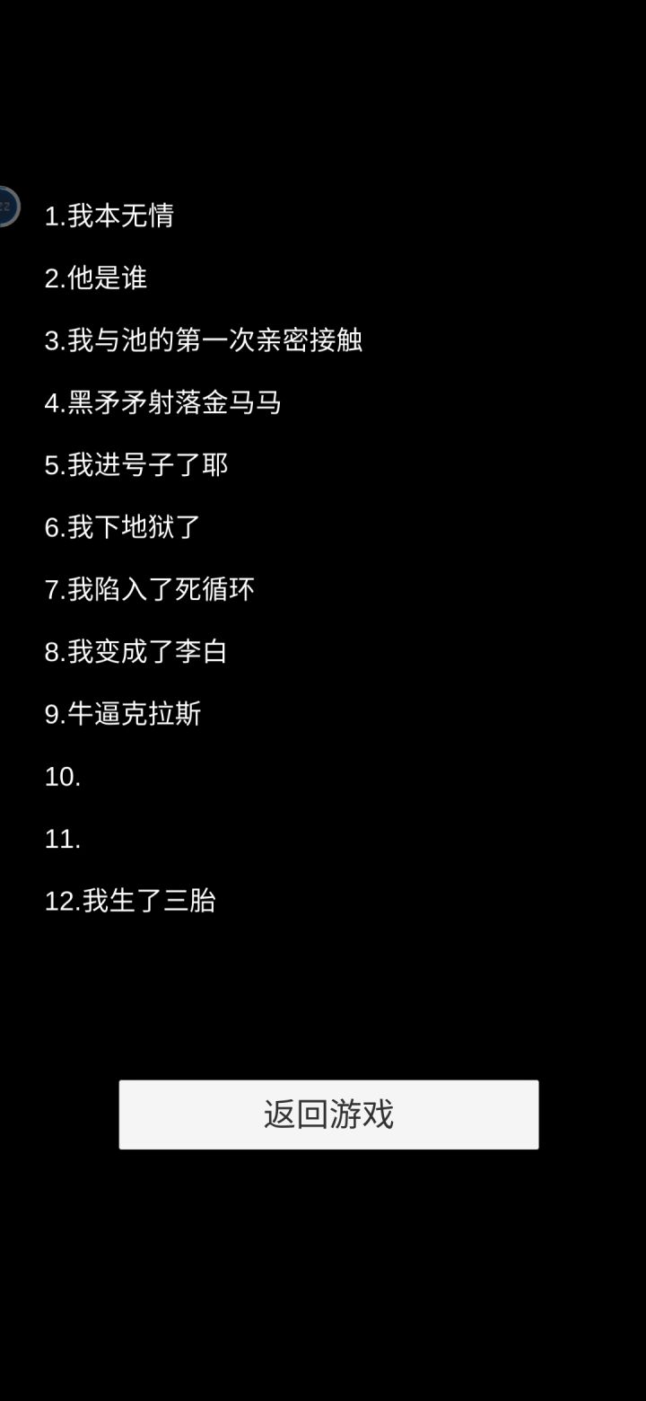 完结撒花!虽然不知道为什么图1显示打了13个结局,但是图二还是正常十二个。整个故事太sjb了每个选项我都笑到头掉,作者大大非常人也。短小但是脑洞很大,第一个打出来的就是广告结局但是居然没有广告!呵成功引起我的注意。然后疯狂安利给朋友hhhhh。10和11在p3那个煎熬的时候(不答应李白,不远走高飞)选坚持,最后在p4多等一会会出现隐藏选项。