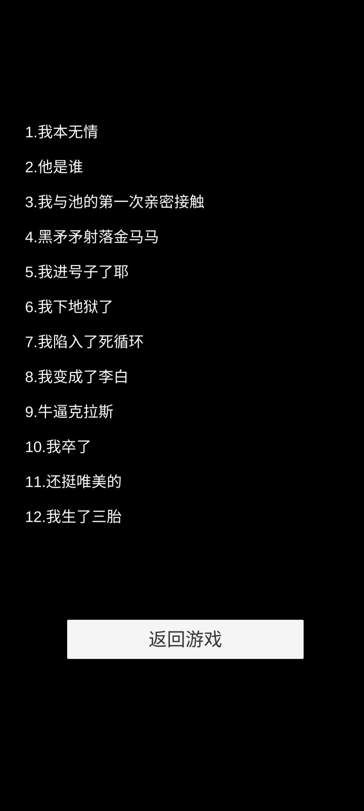 好吧,我真没想到我会玩这种游戏。但是静下心来找个安静的地方玩一下,还是不错的。第二个结局,嗯嗯,真是卖麻批啊,还好我有点心理准备。第十,还有第十一的结局,目前还没有达成。嗯,之前他那个上一款游戏,我也玩过,但是没有那么多耐心,就是玩了几个结局就没玩了,那个时候心情比较烦躁。但是自从我领悟人生之美好,世界之美妙。我终于把红尘俗世根给……………………