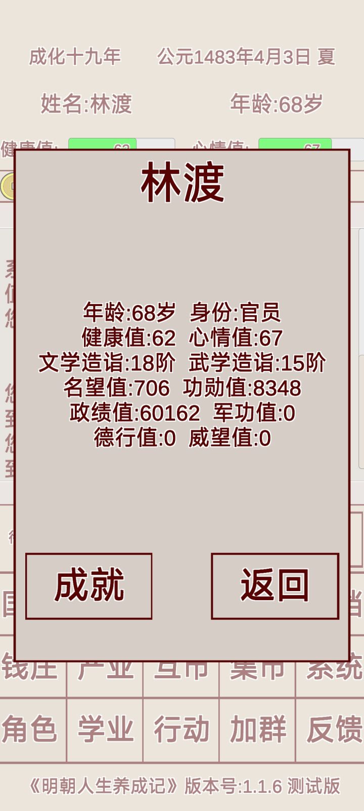 这游戏,前前后后玩了五六次,终于这一次破了个人记录。东初名下开发的游戏,我基本都玩过了,总结就是:游戏设计还行,数据平衡不行,各种稀奇古怪的小bug。比如,我之前以为种田就行,收益算是比较合适的?然后,今天又发现,种田不如存款种田一亩地20000文,亩产300斤左右,卖900-1000文,年化收益5%以下而存款,中低级是2.5%左右一次,一次三个月,年化就有10%了。而高级