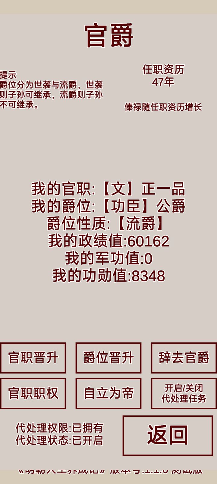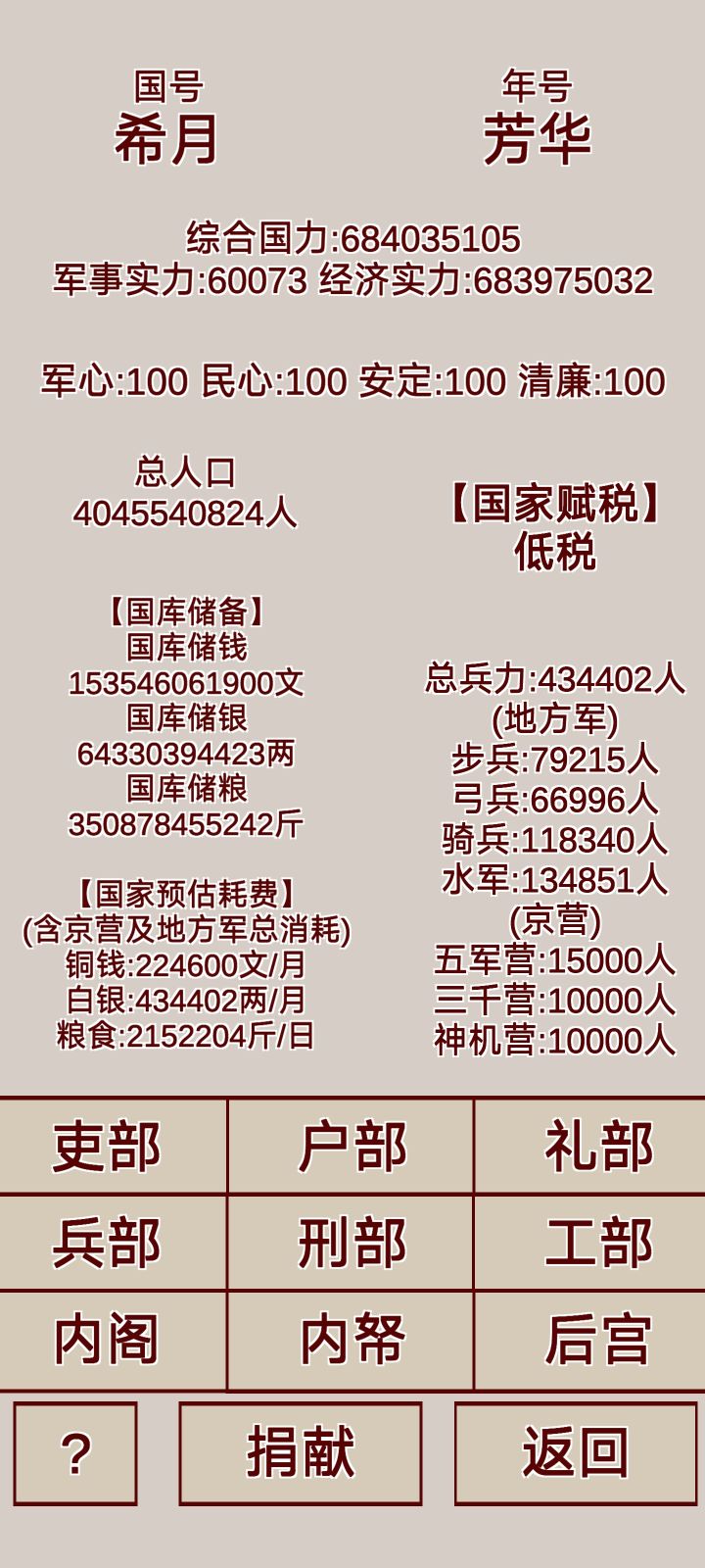 咱们这个主要讲自立为帝以后的玩法1、国家属性总军心、总民心、总安定、清廉 国家属性不会影响地方属性,但是地方属性值过低会影响国家属性2、吏部以往的版本中所有官员是没有被任命的需要手动任命,咱们这个版本呢都是被任命好的但是这些官员属性咱们都不知道所以我都是罢免以后从新任命 因为京官的官员政治都90以上会随机增加国家稳定(当然政治61以上的也可以用但是不会增加稳定)地方官员布政使 政治90以