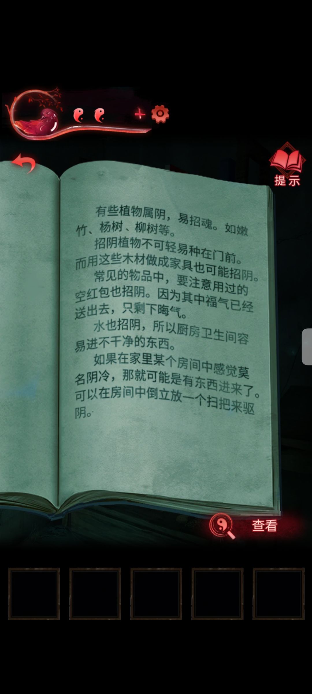 点门出不去 点桌子抽屉 之后闹鬼 日历被吹走 点击日历位置 之后拿到钥匙 用钥匙在打开抽屉 之后成功出门 遇到鬼打墙 正式开始 这里点击左边箭头 拿起手机 观看 可以看到一组密码 这个密码是桌子上哪几个碗筷子的密码 密码是丧喜贺丧迎 碗会空得到一个铜钱 之后来到右边 点击易寿堂的窗户 看到一组密码 这组密码是 最开始老人手里盒子的密码 密码是042 打开后是玉如意 之后来到易寿堂旁边的屋里 六宝