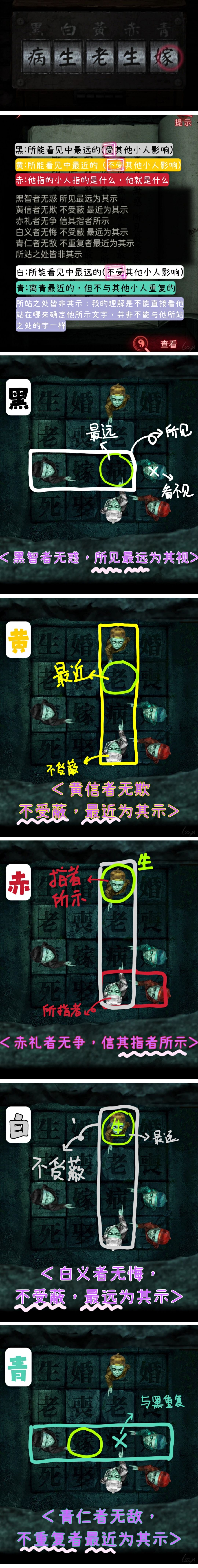 ①黑:所能看见的中最远的(被其他小人所占就代表看不见,排除)——病 ②黄:忽视其他小人,被占的也能看见,其中最近的——老 ③赤:与他所指的小人(白者)所示是一样的——生 ④白:忽视其他小人,被占的也能看见,其中最远的——生 ⑤青:与其他小人所示不重复的中最近的——嫁 【感谢评论区大佬提供的新思路,大家可以自行判断】
