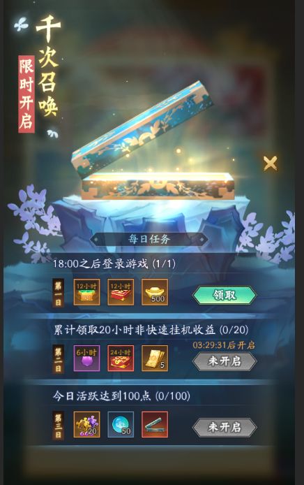 《神仙道3》修仙测试将于5月19日上午10点开启。小精卫特意为大家盘点了一下本次测试的福利活动,方便道友们查阅,以免错失福利~福利一:天赐福利登录前三天完成任务即可领取天赐福利。第三天可获得月光宝盒,获得千次抽卡机会,道友可选择其中最心仪的一次十连抽结果进行保存。福利二:每日福利本次测试为限号删档不付费测试,我们会通过邮件为各位道友发放高级召唤券、元宝和培养资源等福利。每日10点通过邮箱发