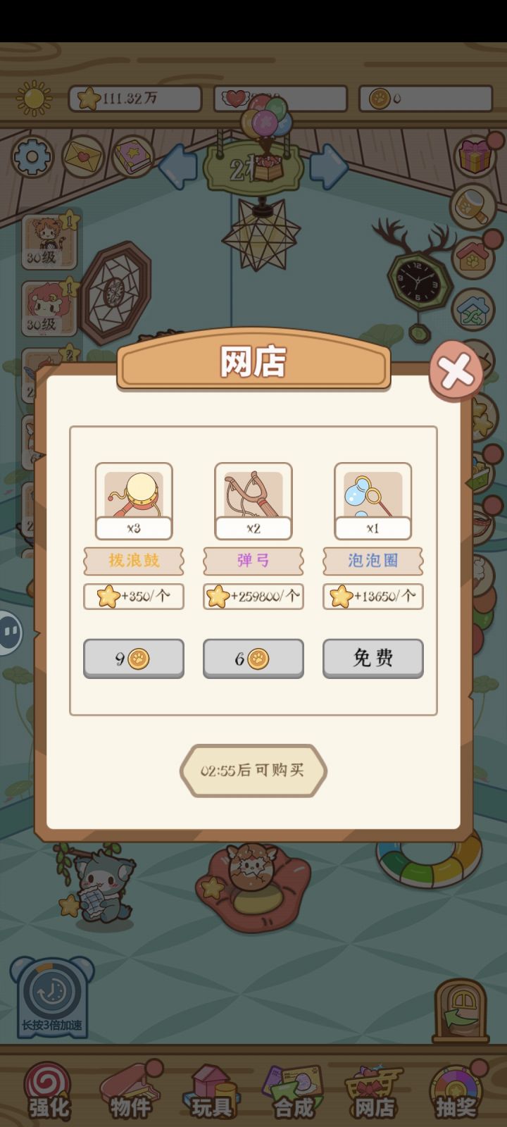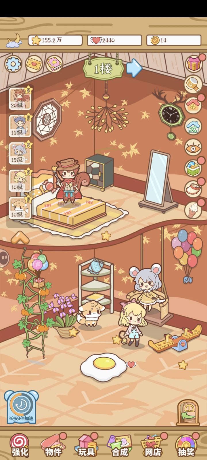 但是机制上稍微有点欠缺。一是离线收益低,低到你一天只上线几分钟的话是根本玩不了的,推动游戏进程的只有在线挂机,而挂机这个事儿吧,开连点器挂一晚上就能搞定(虽然我没试过),所以挂机派和偶尔看看派都得不到很强的满足感。二是可玩内容较少,目前游戏里的所有内容只要放在那里就能就行,趣味性仅停留在收集家具、挂机收票买宠物和等宠物长大,不过作者大大预告更新里说会增加玩法这还是很期待的。三是道具的设计上不太充分,星星道具既是宠物经验值又是宠物的掉落品又是升级家具的消耗品,家具升级完了之后又会提高宠物提升经验的速度又提高星星掉率然后又能升级家具,本身就形成了一个闭环,这使得其他的环节道具和星星道具的联系性并没有这么强;宠物凭证道具上是两两合成的机制,但你说自己动手合成吧时间长了很机械很容易枯燥,一键合成他又得你盯着一个一个合成很浪费时间而且只能往上不能往下分解,听后期高级玩家说想要低级票升星但很难刷了;金币道具最大的不足就是数量少还用处多,免费领取2分钟10个币,解锁宠物图鉴一个给5个和抽奖概率得金币,平均挂两分钟的话顶多20个,但买玩具升级玩具强化家具分类都得用币,而且家具和玩具的种类都很多每一种都要单独升级,我吧玩具一买基本就没钱升级了,这样一来虽然金币很重要但是稀少的数量强制降低了他的重要性(反正不够用干脆不升级不买了)。四是后期的空白期很长,虽然我现在只到了四楼,但我看着那三天都没孵出来的蛋我还刷不到水晶球真的有种卸载的冲动