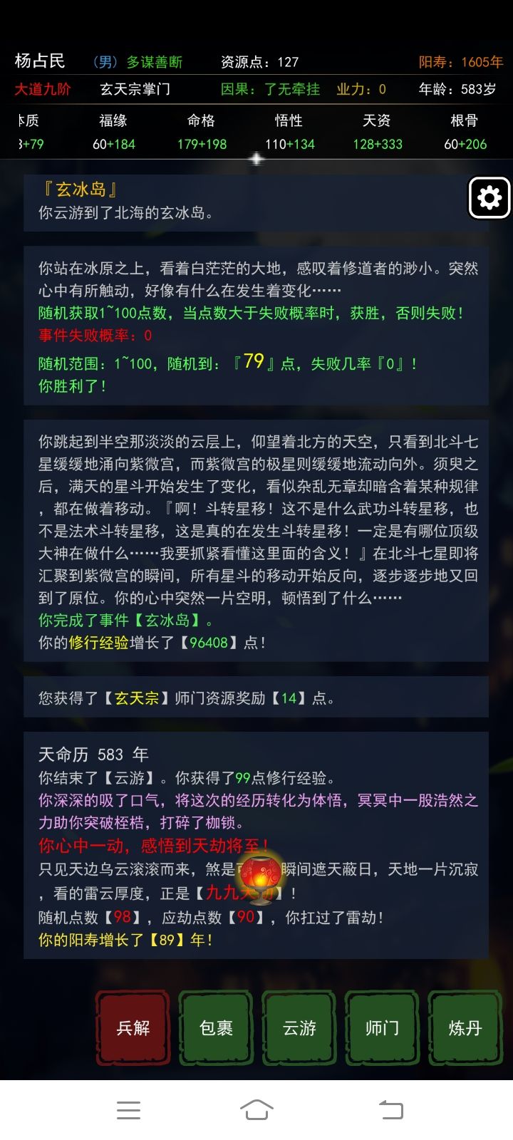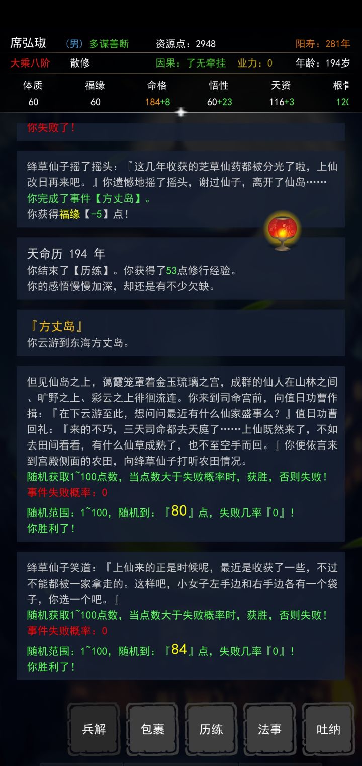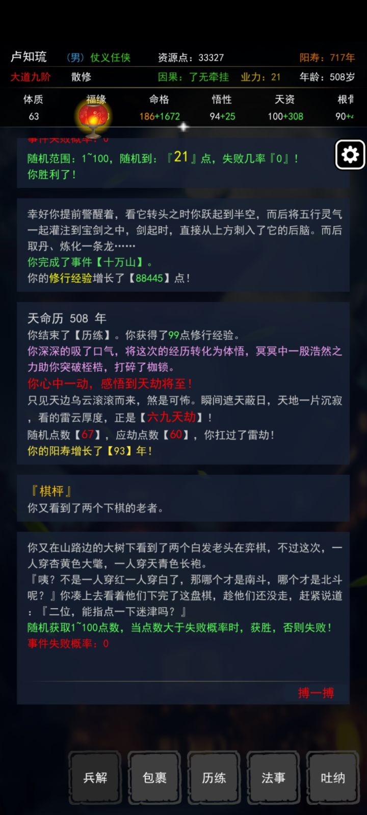 只要能弄到棋枰事件,就可以降低其他事件的出现概率。但是也会降低修为获取的效率。如图所示,加了这么多命格,有什么用。。。棋枰把冰岛,不周山,方丈山等事件都挤没了,虽然有助于通关,但是很难。