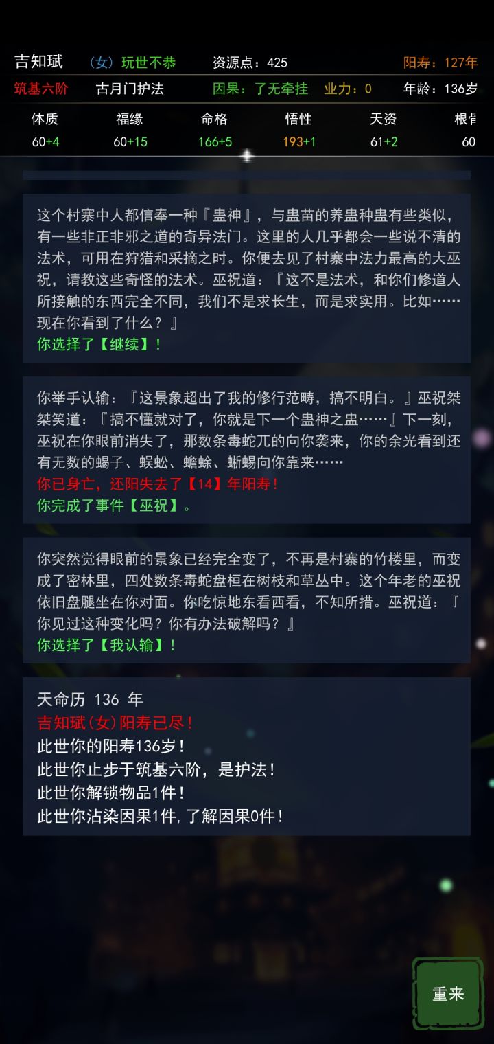 玩到大道九阶,没注意飞升时间,好像是400多年,然后再兵解就卡住了,清后台,再进去也是黑屏,只能清数据了😔😔