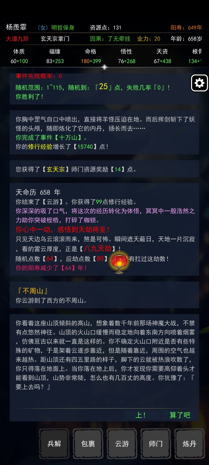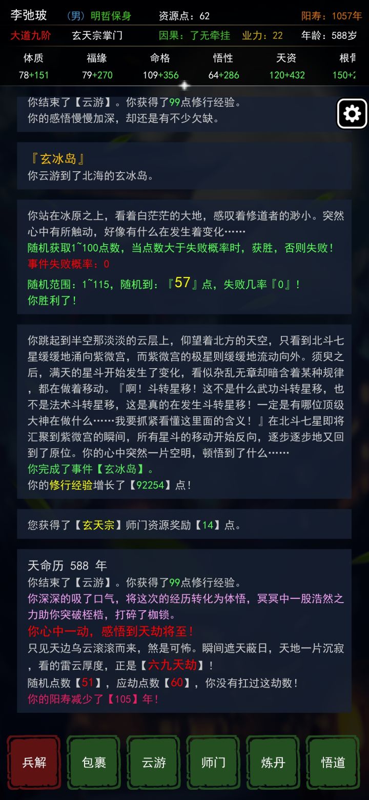 只要能弄到棋枰事件,就可以降低其他事件的出现概率。但是也会降低修为获取的效率。如图所示,加了这么多命格,有什么用。。。棋枰把冰岛,不周山,方丈山等事件都挤没了,虽然有助于通关,但是很难。