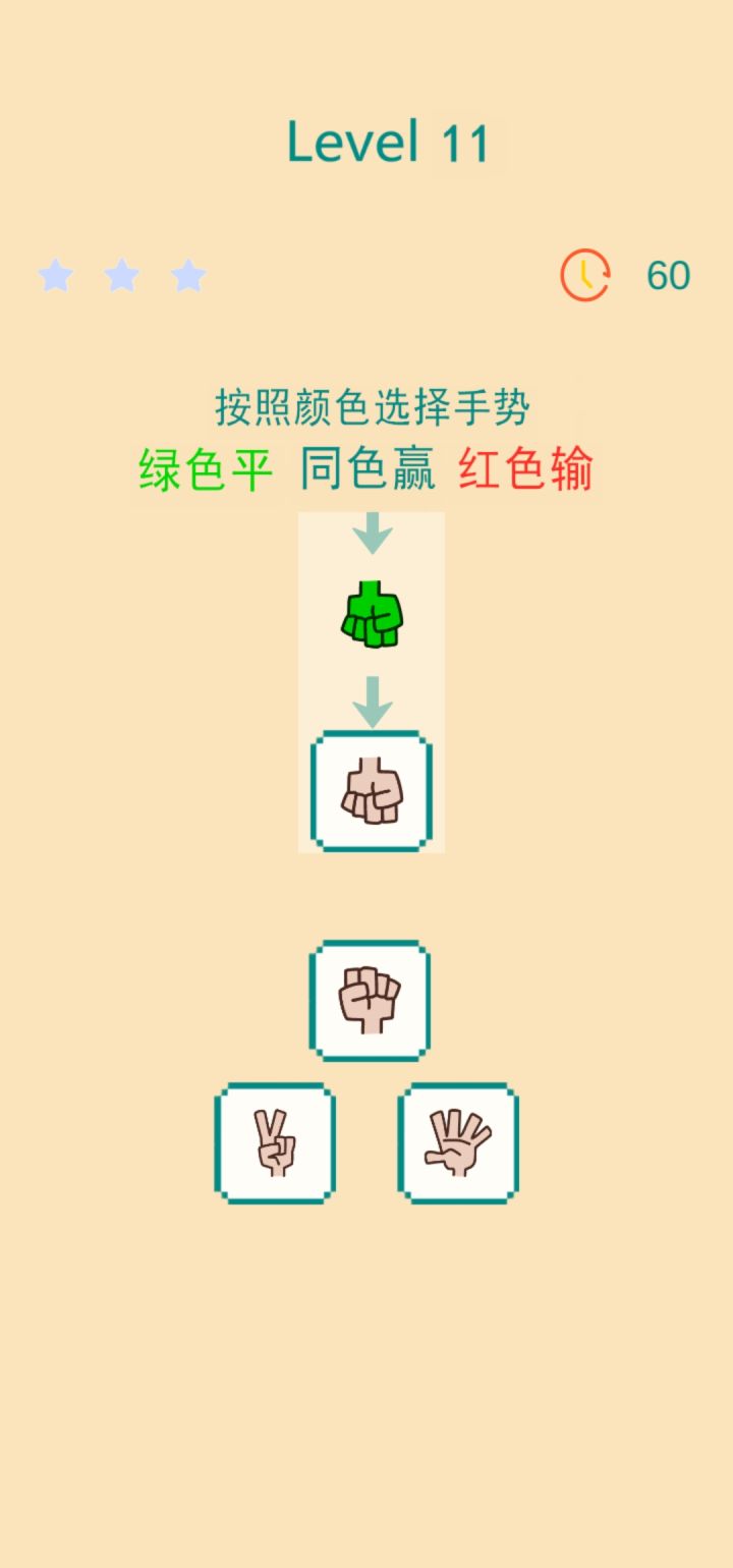 1. 添加练习模式,多练习才能更好地闯关2. 更新第11-15关卡:11:按照颜色选择手势,绿色平、同色赢、红色输12:找出颜色变化的按钮13:成语秀才14:找出1-25中遗漏的数字15:繁体字和简体字配对后续关卡敬请期待!