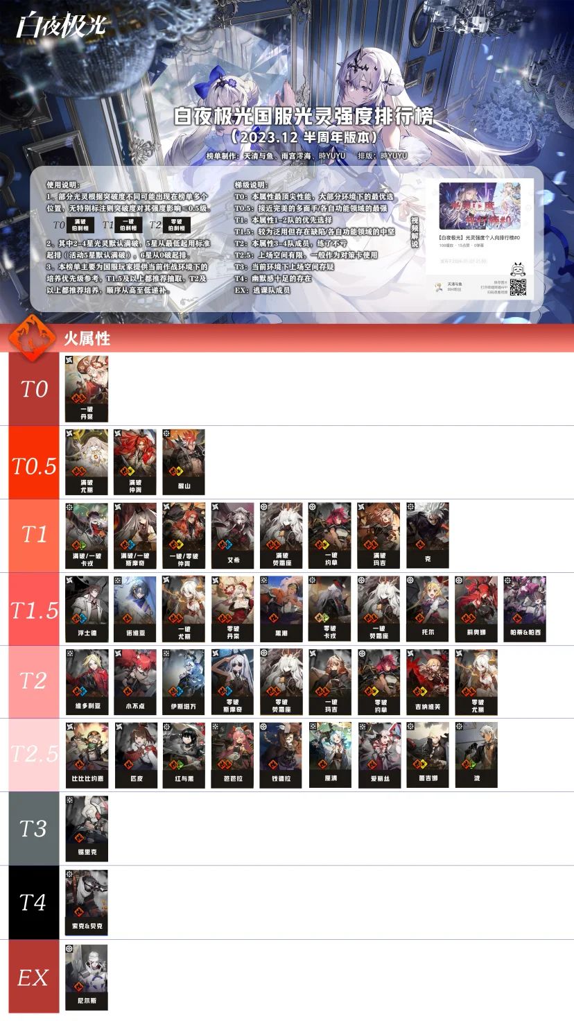 转载自B站,感谢天清与鱼,雨宫澪海,時YUYU三位佬的辛苦制作。 另外多说一句,不喜勿喷。强度榜很容易带节奏所以也叫节奏榜,榜单更多地是为新人做抽取和拉角色练度准备的,老玩家简单做个参考即可。例如荒典环境更看重战场词条,强度方面根本无法下一个准确结论,每期都会有变化。我认为最起码要尊重人家的劳动成果,可以一起讨论但不能一位地贬低,一棒子打死最后的结果是没人再做这种费累不讨好的事了,这应该不是大家想