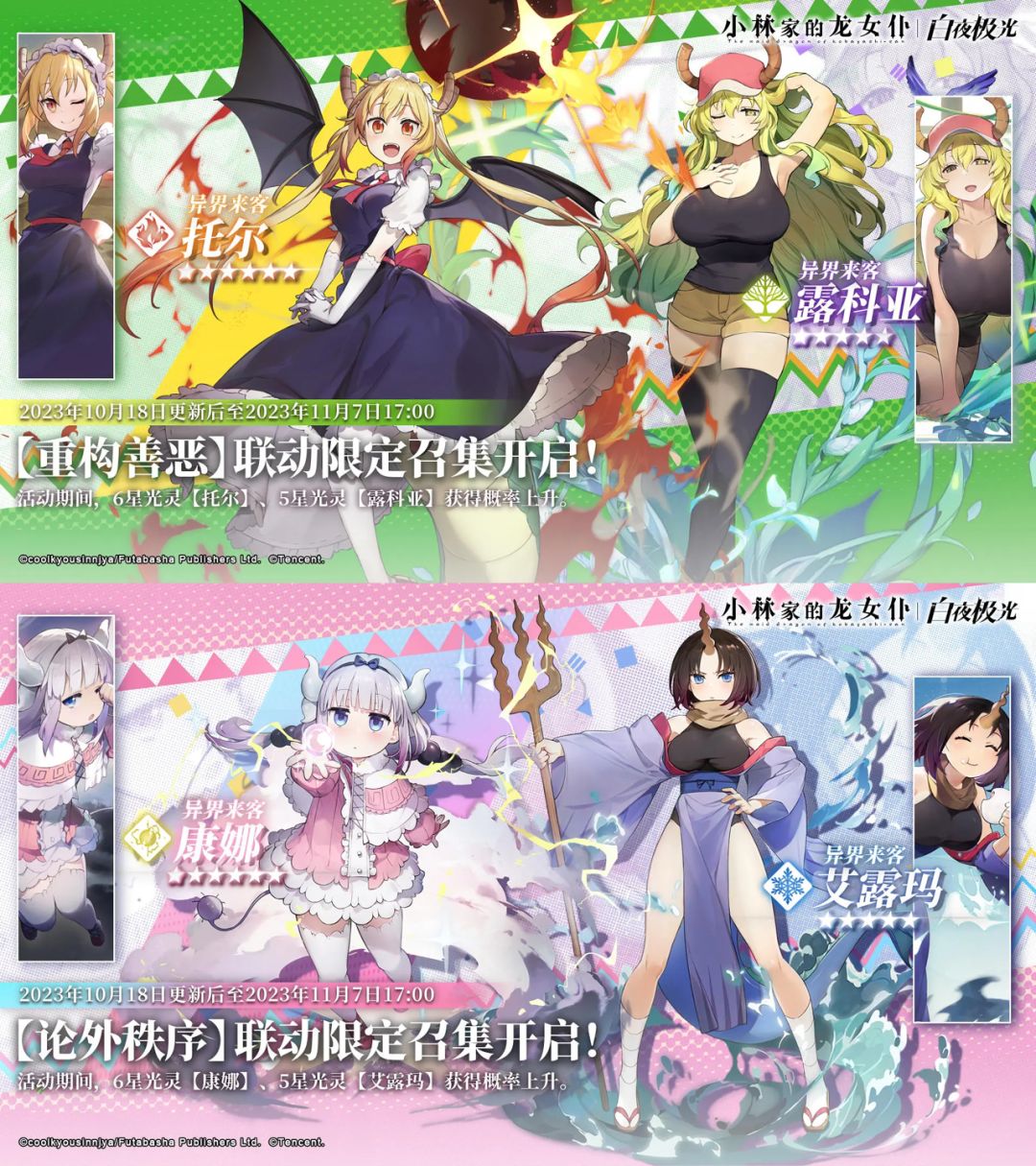 你游转眼间已经开服4个月了,迎来了第一个联动限定卡池——小林家的龙女仆,相信有不少朋友是奔着这次联动而入坑或回坑也就是所谓的厨力党,下面我会抛开XP只论强度对此次联动及伴随的轮换推荐针对萌新做一个简单的卡池抽取建议,如果有表述不清或有不同意见的朋友欢迎一起来讨论。 另外,论坛里有不少朋友发布了很多攻略帖子,在这里我挑选出了一篇比较详细的,其中虽然有少许介绍说明不适用于老玩家但对于萌新而言算是一篇
