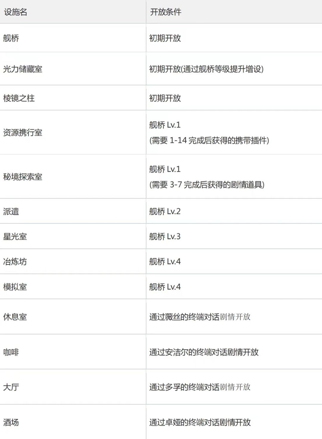 *文章来源 appmedia,个人渣翻,欢迎抓虫 设施开放条件 开放设施时舰桥的等级至关重要 各设施的开放需要提高作为巨像核心的舰桥等级。 舰桥升级需要中枢插件,所以如果不推进主线故事,就无法进行升级。 终端对话活动也可开放 部分设施需要在终端(终端对话)中与特定的角色对话才能开放。 与在舰桥上开放的其他设施相比,虽然没有资源产出,但是可以增加放置的家具数量,可以提高气氛。 增设光力储藏室 初期开