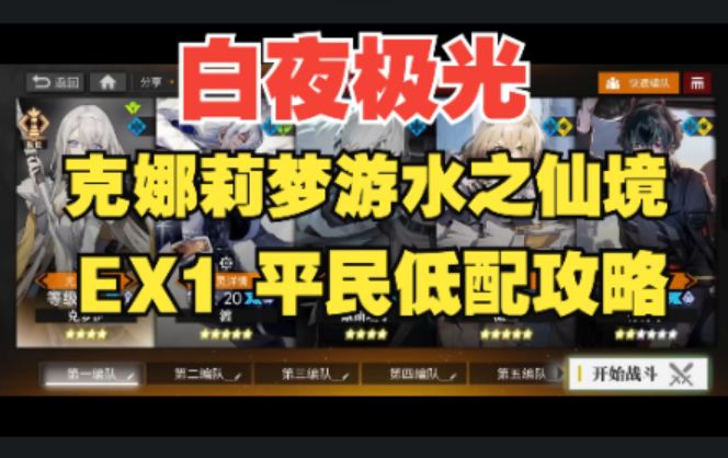 大家好,我是侦探! 这是【克娜莉梦游水之仙境EX1潜梦】的【平民低配攻略】,这一关真的很难,我打了一上午的无六星阵容,最后还是差了6%的血量没拿到3星,最后还是换上了弗劳尔,打了一个单六星低配攻略,希望能帮到大家~ 弗劳尔可以换成克娜莉,也可以换成满破的森系库斯库塔~(我用的是一破,局限性真的很强) 侦探会尽可能给出更加平民化/更低突破/更低练度的轻松解法,让大家更容易的拿到三星奖励! 白夜极光没