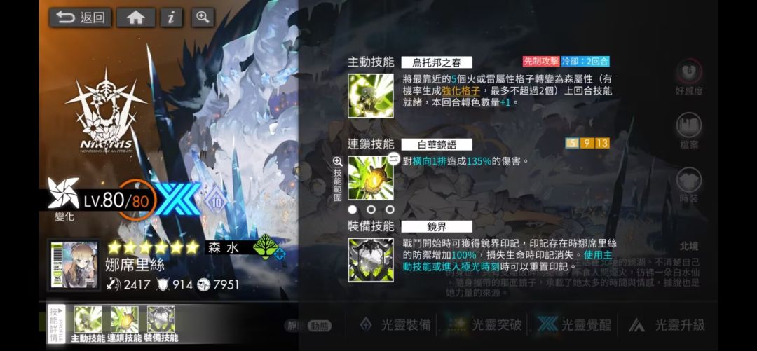 我们常说绯是森队成型的最后一块拼图,但其实那席里斯才是梦开始的地方。这个森系光灵作为森队隐藏的功臣,虽然不能打出爆炸伤害,却可以辅佐每一个森属性的主C抵达他们的巅峰,可以说是流水的主C铁打的那席里斯。 今天,就让国际服的老玩家带我们了解一下森队的无冕之王,北境少女那席里斯。 角色点评: 那席里斯和其他三个初始推荐的六星转色光灵一样,具备短CD多属性的转色技能,0突破即可享受的先制攻击,稳定可靠的连