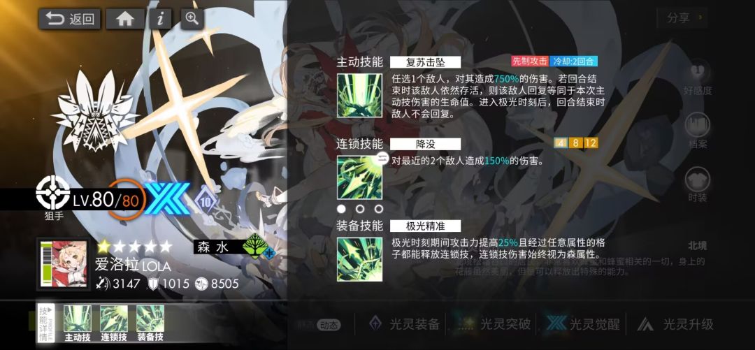 森系的狙手各有各自特色,但论起简单直接,新登场的爱洛拉绝对是你见过最擅长爆头的森狙光灵。今天我们就一同来了解一下这位新登场的森狙---爱洛拉。 抽卡建议: 爱洛拉能够简单直接的提升森队灾典的表现力,推荐大家抽取备用。并且相比较突破,觉醒对于爱洛拉的收益更高,养成的性价比极为优秀。 角色评析: 主动技能:复苏击坠 任选一个敌人,对其造成伤害。若回合结束该敌人依然存活,则该敌人回复等同于本次主动技伤害
