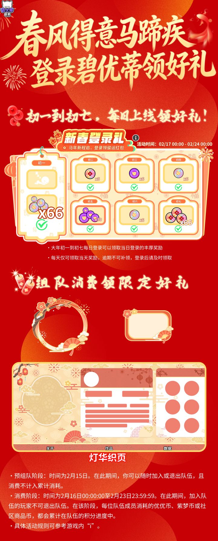 亲爱的宝子们:冬尽春回,万象更新。在这辞旧迎新的时刻,官妈先祝各位宝子们新春快乐,万事如意!随着新年的钟声即将敲响,《碧优蒂的世界》也将迎来最盛大的庆典。新春系列活动将于 2 月 12 日起陆续上线,全新的奇幻旅程与丰厚福利正等待着大家~详情请看下图:#碧优蒂的世界