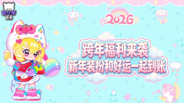亲爱的玩家们:先和大家说个热乎的好消息——我们已于 12 月 30 日 11:00 完成不停服维护,跨年主题福利已经全部就位啦!新年当然要“穿得更好看、玩得更热闹”,所以这次我们把限定装扮、通行证福利、福袋好运和一大波道具统统端上来,希望大家一登录就能感受到满满的年味。也提前祝大家新年快乐:愿你在BUD里天天都有好心情,抽奖出金,拍照随手一截都是氛围感大片;更重要的是——新的一年,顺顺利利
