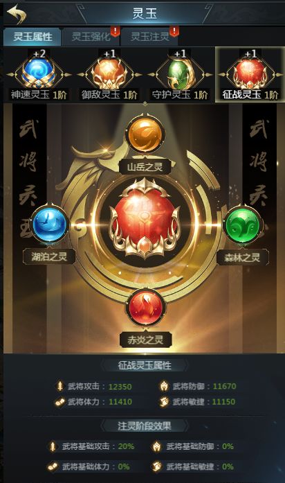 武将灵玉是武将等级达到150级且兵书均四星才开启,也是提升武将战力的主要途径之一,有很多玩家不是很了解灵玉是如何强化提升战力的,下面为大家介绍一下灵玉的玩法。 一、灵玉类型 神速灵玉 御敌灵玉 守护灵玉 征战灵玉 二、灵玉属性 每种灵玉都有以下四种属性: 1、山岳之灵 提高武将防御 2、森林之灵 提高武将敏捷 3、赤炎之灵 提高武将攻击 4、湖泊之灵 提高武将体力 三、灵玉强化 强化山岳、森林、赤