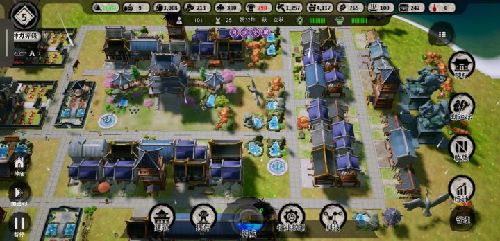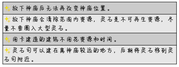 1、 开局第一个要做的事情是选一个近处有资源且有空地的位置,配合神庙放下去清除范围内资源的效果,可以开出一大片空地,这样可以有效减少初期由于空地紧缺造成的布局困难。2、 首先要点击中间的圆形神力按钮,使用开采灵石卡获得一个灵石司。灵石司是非常重要的建筑。同时你还可以获得200点劫运点用于在劫运坛中购物。3、 初始赠送了3个古旧的神像,这是用于结交各路神仙获取他们神力的核心物资,可以在神权界面中