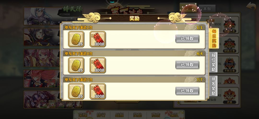 各位白嫖党们不要错过每日判金的获取,判金的获取与合理使用,关乎各位白嫖党们的游戏体验 1.11:30的防守任务 根据家族城池数由400-1800不等,加上杀敌奖励由0-1000+不等,如果不能按时可以将兵放兵营让家老与族长派送 2.天下演武 点开荣誉参赛两位王者可获得50金(这个容易忽略) 每天打满奖励可获得150金 3.勇冠三军 打满5次胜利可以获得300金 4.小庭院 每日5点与18点刷新,完