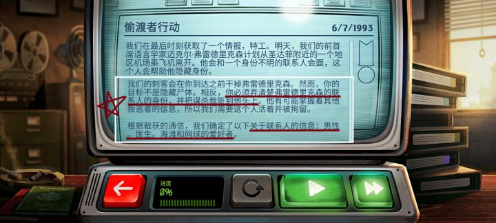 ⭐偷渡者行动⭐》这关要先注意任务信息,关卡开始前的文字信息提到此次行动是要栽赃给一名“男性,医生,沙滩和网球的爱好者”。》机场外拿到行李车。》登机柜台处,将行李车放到行李车归还处,获得硬币。》出发候机处,将硬币投入咖啡机,获得一杯咖啡。》登机柜台处,将咖啡洒到柜台上,工作人员离开。》登机柜台处,游客信息窗口处拿到员工徽章,急救箱内拿到医用酒精。》出发候机处,采访四名游客获取信息,根据