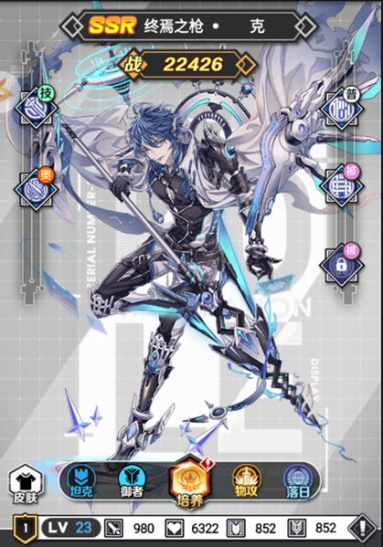 小编本期讲讲落日的第二把手终焉之枪· 克也是超时空穿越来到落日的一名SSR,坦克系且有伤害的SSR不少见,但是又肉又有伤害还能反击的很少见~战技:对敌方直线造成140%伤害,并提升10%的格挡率2回合,并有50概率反击 ,达到满级时可提升到190%并必定反击+格挡率提升至20%。普攻:对敌方单体进行连续攻击,最高可连续打3次,连续攻击概率为60%造成55%伤害。达到满级时提升至80%+本次攻击