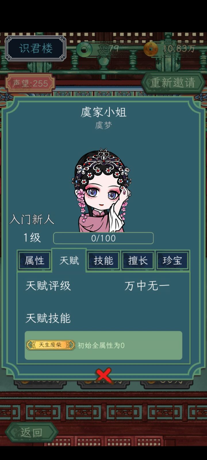 开局选个江南才子,因为他最贵,对于前期贫穷的老板们来说最划算了然后来讲突破,重点是看清属性呀老板们!首先点开你小伶人的属性页面,看看那个属性最高,包括()里面的加点,你就大概明白这货是什么路线,文戏高的选文戏,武戏高的选武戏!重点就是看清楚!!突破词条是可以更换的!选个合适他们的就行,前期突破无难度,选对就行。接下来就是买才女!升才女!!突破才女!!突破顺序是
