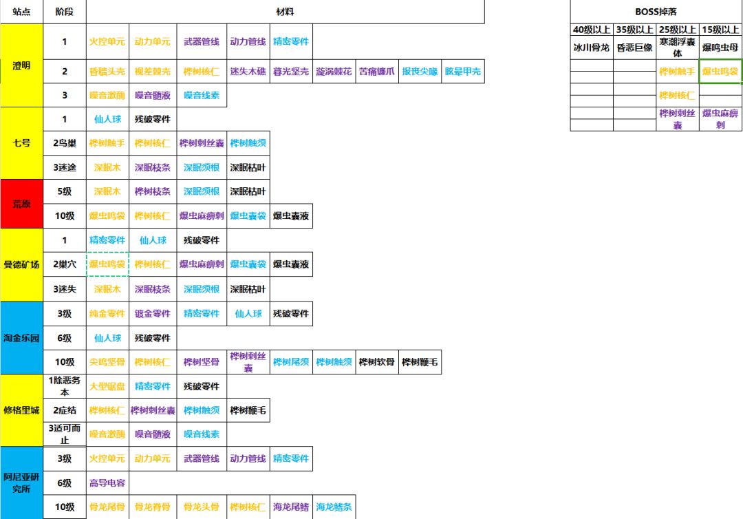 看到论坛没有汇总最新的,自己做了一个,希望对有需要的人有帮助。因为是表格转PDF再转图片,可能有点不清晰。 - 图片太长不看:只需要关注两个种类合计五个地点。 购买材料:曼德矿场、荒原站、铁盟哨站、阿妮塔战备工厂。 掉落材料:澄明数据中心。 - 虽然内容没多少但是做了一天,属实是累得透顶,头痛。先吃饭了,好饿,也没吃晚餐。