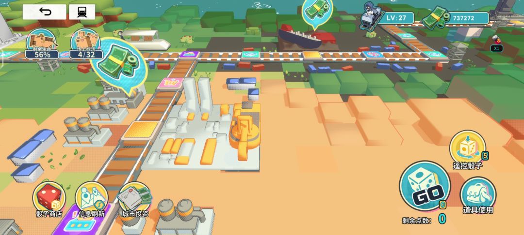 仅限目前体验,可以补充和质疑[表情_微笑] 纯黄色站点:城市 可以投资 劫掠者标志:抢劫事件 可以交钱过,可以打架过,奖励只有仙人掌 紫色标志:特殊事件 奖励一些物品,每次进入这个点都会升级一次这个点 购物车标志:买东西 买道具 骰子标志:赌博 猜大小 礼盒标志:遗失的物品 一些东西 移动:扔骰子走一次,每走到新一步可以用一次道具,到一次城市可以投资一次,岔路口可以自己决定方向,到尽头多余步数会往