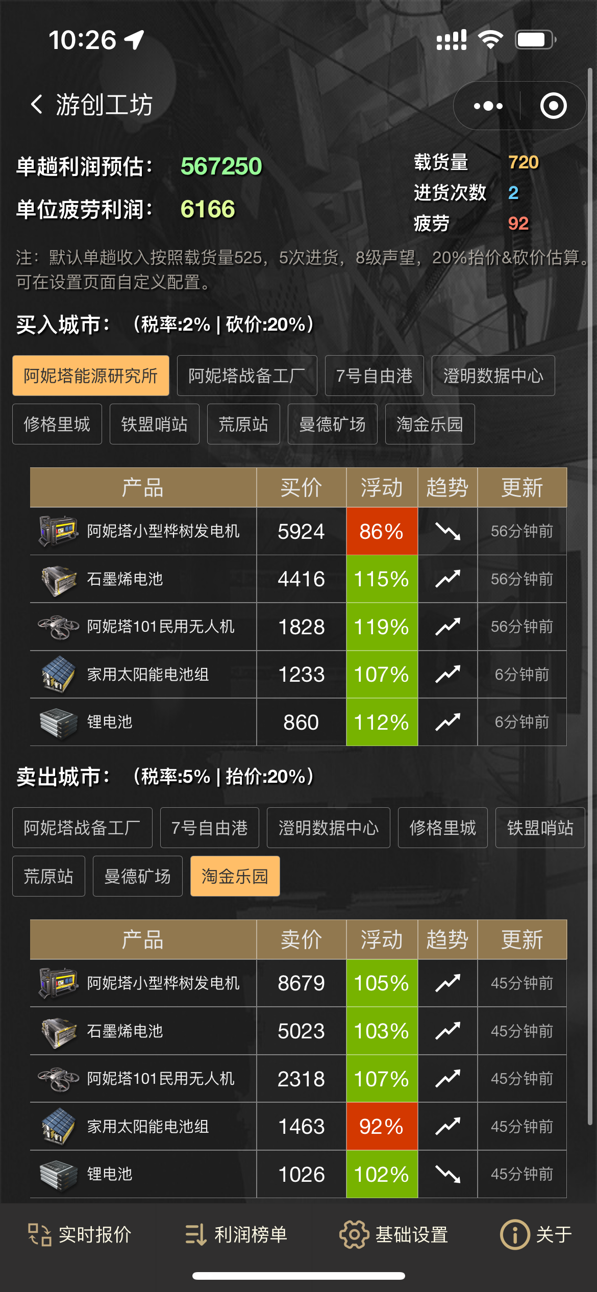 这个时间段没有低门槛货物很赚钱的。 赚钱的货物门槛都比较高。大部分需要先投入70万左右。 1.铁盟炮弹,到修格里城。一趟5到10w。 2.澄明数据银矿石,到7号自由岗10w左右。 3.荒原绿松石,到曼德矿场。10w左右一趟。 4.曼德矿场工具箱,到7号自由港。15到20w一趟。 5.修格里城弹丸加速,到曼德矿场,15到20w一趟。 6.淘金乐园沙金,到荒原站。25w左右一趟
