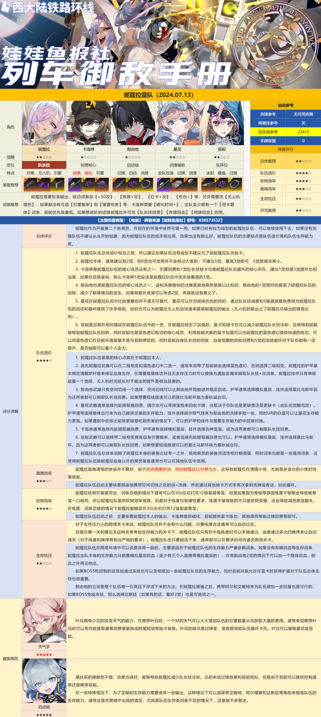 哈喽大家好,雷队限定大c妮蔻拉已经复刻,娃娃鱼报社也为大家更新了目前主流的妮蔻拉雷队攻略。妮蔻作为老牌限定主c,由于其对单的特点以及练功的相对困难,其低金队伍的竞争力正在减弱,如果现在想要从零开始组建妮蔻拉队伍的小伙伴们要慎重考虑哦~ 当然,完全体配置的雷队仍然具有很强的竞争力,那由他和空间切线联手提供了开局快速,苔妮的加入也一定程度上弥补了传统雷队生存不足的问题。现在的妮蔻拉在砍树,尤其是12