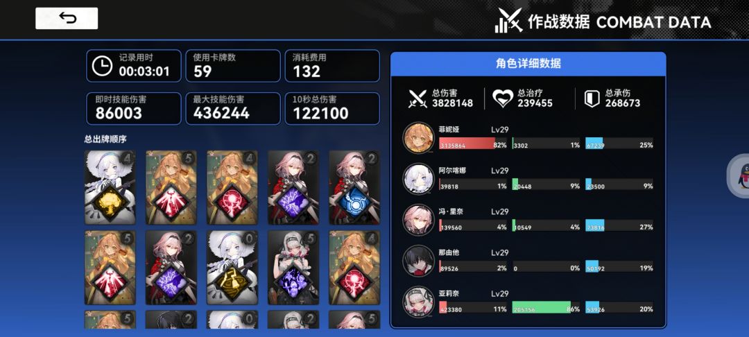 主c为小红帽,队长技需要抽卡九次,所以需要能过牌的队友,推荐那由他和冯里奈。但由于他俩的抽牌技能费用过高,所以可以带个阿尔喀娜 阿尔喀娜的三技能能从弃牌堆拿回来三张牌,对小红帽弃牌越多伤害越也有一定用处。 冯一破后,放反振能抽一张黄牌,小红帽的锦囊,那由他的无敌和冯的三技能,还有阿尔喀娜的二三技能都是黄牌,不管抽到谁都很有用。 最后塞个酒保大姐姐补充一下队伍奶量,如果能二命就更好,二命释放紫卡有5