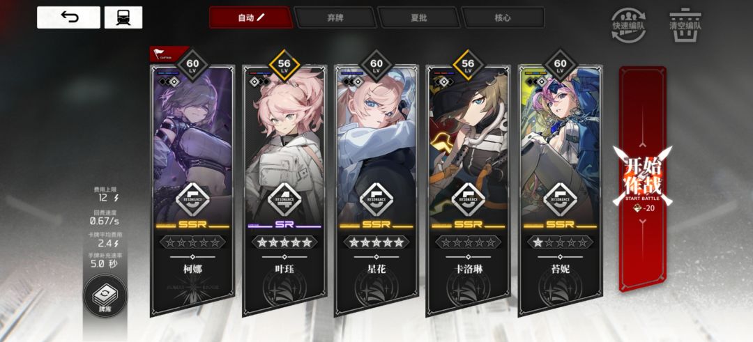 随手录一把,算是平均时间 这几次最好的一次 配队 卡塔斯1觉(没有1觉4分钟起步,1觉提升巨大,并且后面伤害会越来越高) 星花 装备 (武器)内脏*4 (饰品)哈里森*1 (防具)模拟星辰*5 卡莱雅饰品带 ssr无人机 其他饰品无所谓,什么装备刷出每秒+费用或者队长技+费用就带什么,要是没有就带春秋合诚印吧,开局还能多点费用快一点爽起来。莫比乌斯环没有回费词条就别带环,根本就不缺牌。 词缀 卡塔