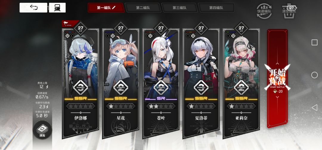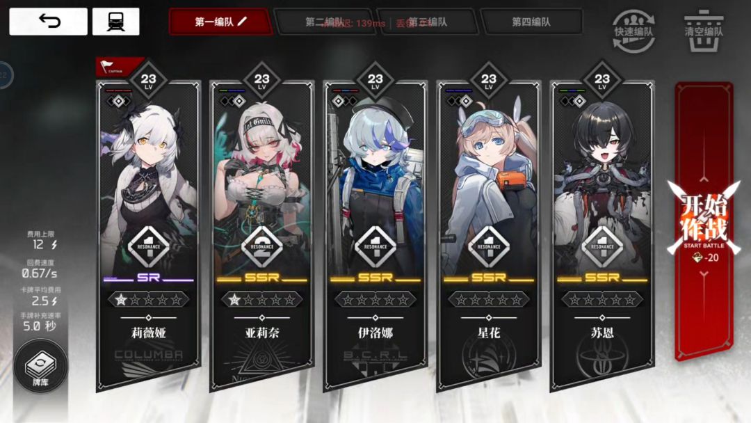 主C是伊洛纳和夏洛蒂,两个大C,队长是伊洛纳,伊洛纳大招用一张红卡放一次,带上星花大招一开直接十次射击往上,苍叶是纯辅助,有低费卡有抽卡,亚莉奈是是作为奶存在的,要是愿意,有雌小鬼(苏恩)的也可以把苍叶换苏恩打双奶(我自选选雷主了)所以我没有(后悔了)