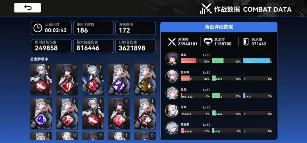 直伤队核心由夏洛蒂+塔拉+阿尔喀娜组成,这两张r卡具有高速过牌能力,并且能从弃牌堆里抽卡,可以保证夏洛蒂的多轮爆发。 那由他作为补充辅助,亚莉奈作为控制加奶妈,只是提高队伍的上限,并非必须卡,可根据环境由其他好用的sr卡和r卡平替。