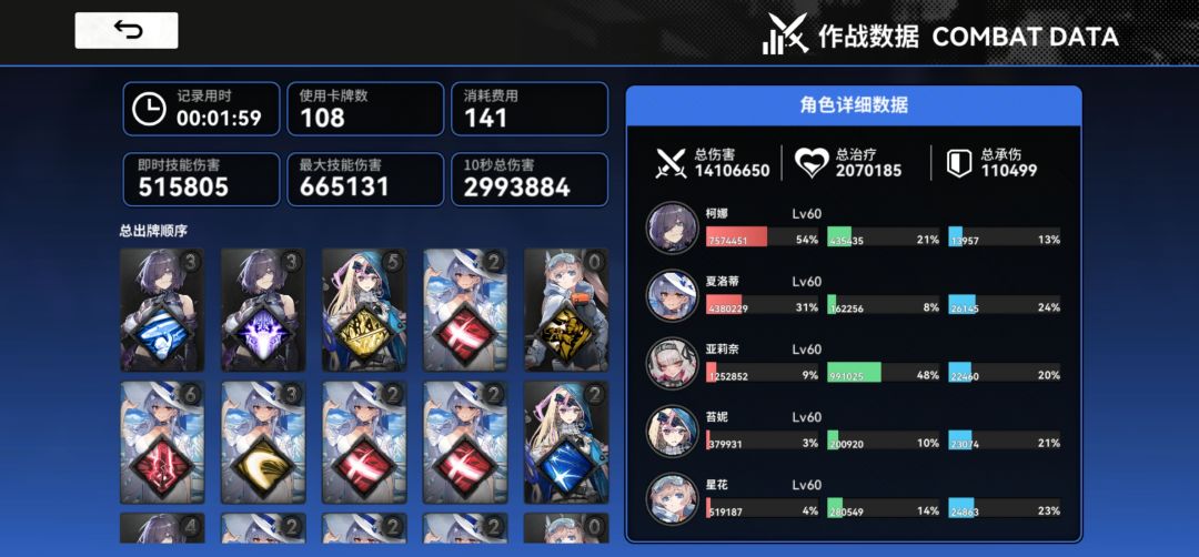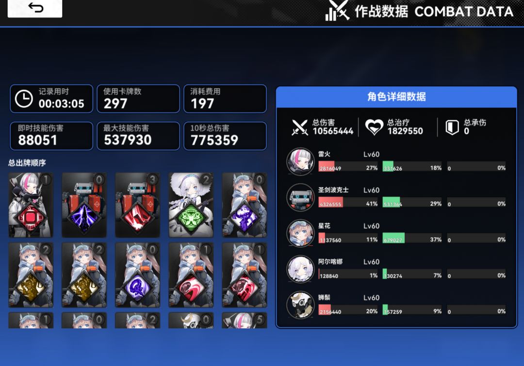 终于给这个骨龙干爆了,36级,一开始不知道该怎么打后面就怼这防御拉,给他磨过去了,治疗牌捏手里是个很不错的选择(如果后排防御不高那很需要这手治疗),马吉拉,亚里奈谁当队长都行但我觉得马吉拉当队长可以频繁放大招,通过加快星花五震的歌唱牌循环进而加速全对卡牌循环,星花的强度真的出乎我的预料!马吉拉也非常不错叠叠乐也好,治疗也好,清小怪都是一流,亚里奈兼顾高坦度的同时也拥有不亚于亚里奈的输出,治疗也是一