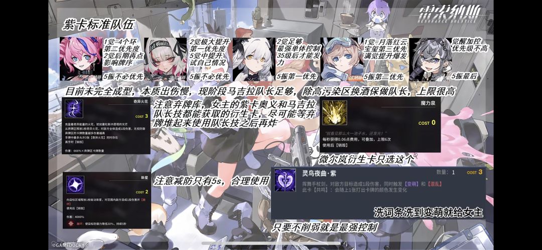 看了很多大佬的攻略,稍微研究了一下,首先我们要明确南半球大招是抽到黄牌或者带引雷词条的牌-cd那么从这方面入手,我们需要的是快速过牌和黄牌和引雷牌。 星花,提供过牌黄牌,加攻速(南半球放两三次大攻速就叠满了感觉没啥用)增伤回费(回一次),其他牌都没啥用加攻击只能前排她吃不到, 雷火,所有牌都有用极强的的过牌能力,但是我们要说一个但是没有红卡主动引爆就得等10秒炸了才能过牌,太慢了。 所以我们上狮鬃