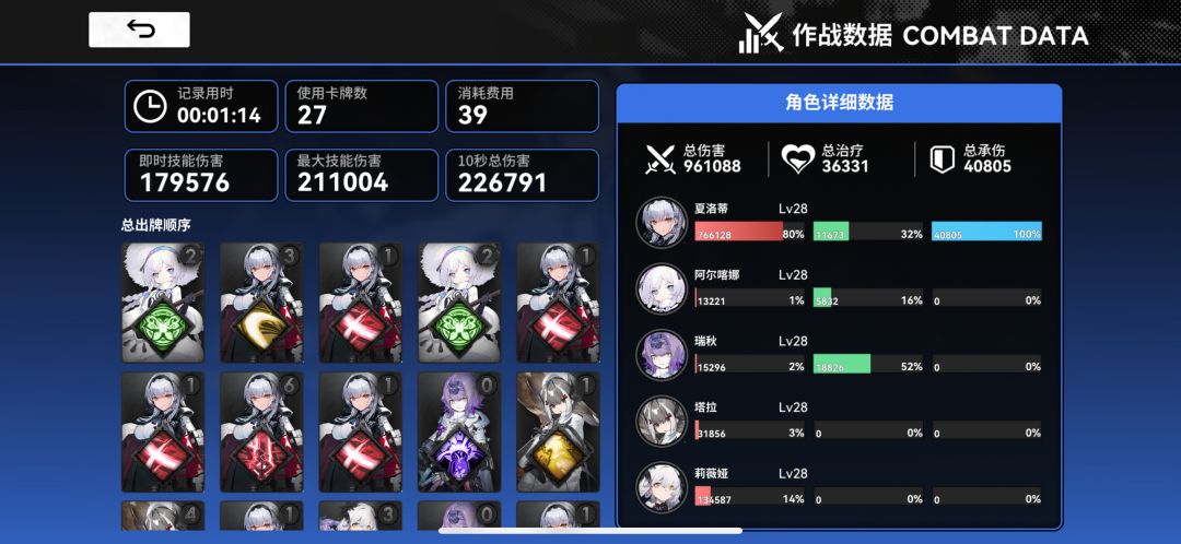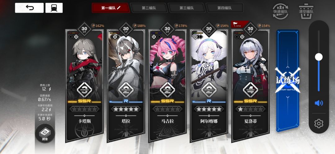 看了论坛的很多配队,字很多,没耐心看,自己根据推荐配了个队伍。 主c:夏洛蒂 t:卡塔斯(可以替换,你喜欢用谁当t都可以,只是个抗伤的工具人罢了,是不是ssr无所谓) 治疗:阿尔喀娜,有一点治疗能力但不多,主要是为了从弃牌堆里拿回夏洛蒂的牌以及回费 治疗替换选择:瑞秋,她的治疗能力比阿尔强,同时也能回费,但也因为她的回费是占用牌组,所以会时不时的卡手。可以看情况替换阿尔使用 辅助:塔拉,过牌和回牌