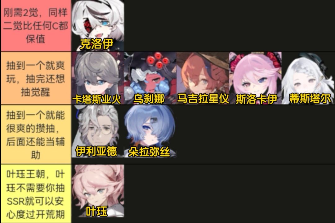 通用:那由他,星花,阿尔喀娜,静流(?) 生存抗压:苏恩 这些练了总能用上,其他角色就要看配队了 至于配队推荐嘛……(省流:弃牌雷) 弃牌雷(零氪首选)>火队>其他 现在组不了紫卡队(除非初始号) 新角色要抽二觉,绑ur专武和防具,还有卡洛琳,愿意肝就抽吧,不然萌新统一推荐弃牌雷 最好攒抽等下一个人权 闲的