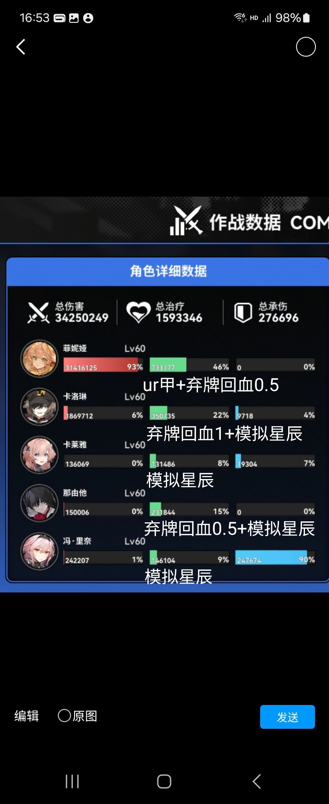 虽然标题是这个,但是如果能梭哈出来酒娘就梭哈酒娘,这前排没别的,就是能奶能抗,控制也还好。 至于详细介绍啥的,恕我打工人,没有那么好的语言艺术,我就直说,这种队就是用来在没有抽到上位替代的时候用来过渡的,伤害没有,优点就是能奶能耗,尽量别用自动,会出差错。 ps 电弓只能撑到30级,最好就是把夏洛蒂弄出来,伤害真不是一个量级[表情_吃瓜][表情_吃瓜][表情_吃瓜]