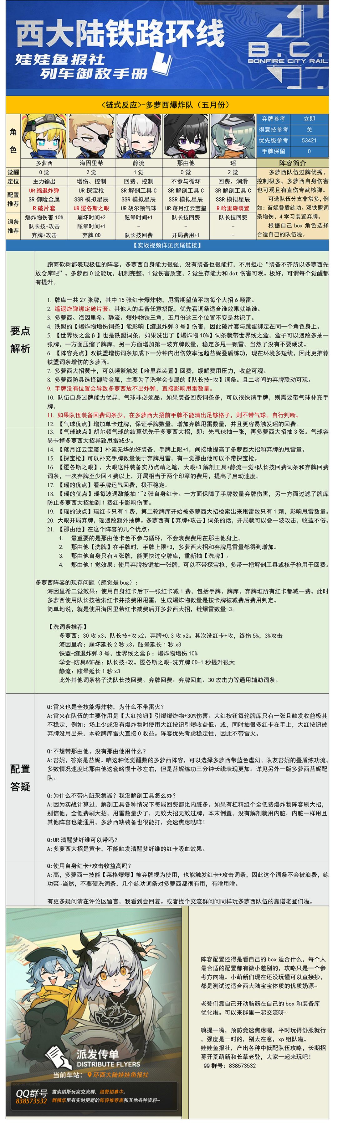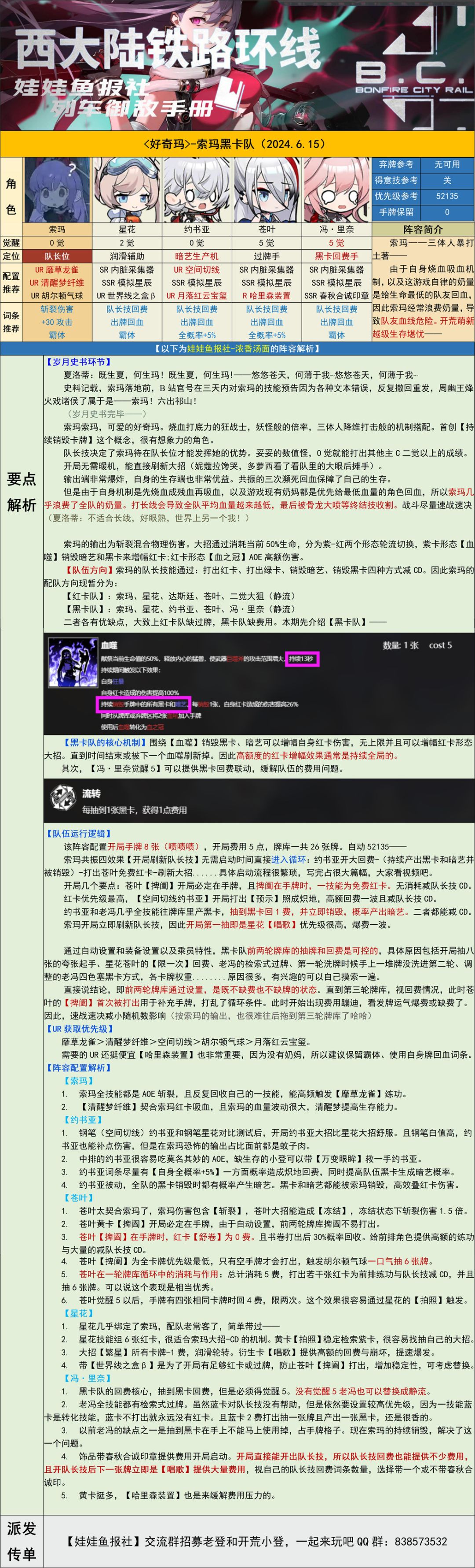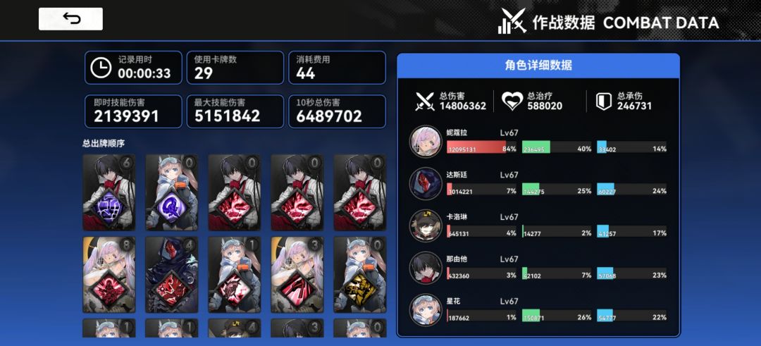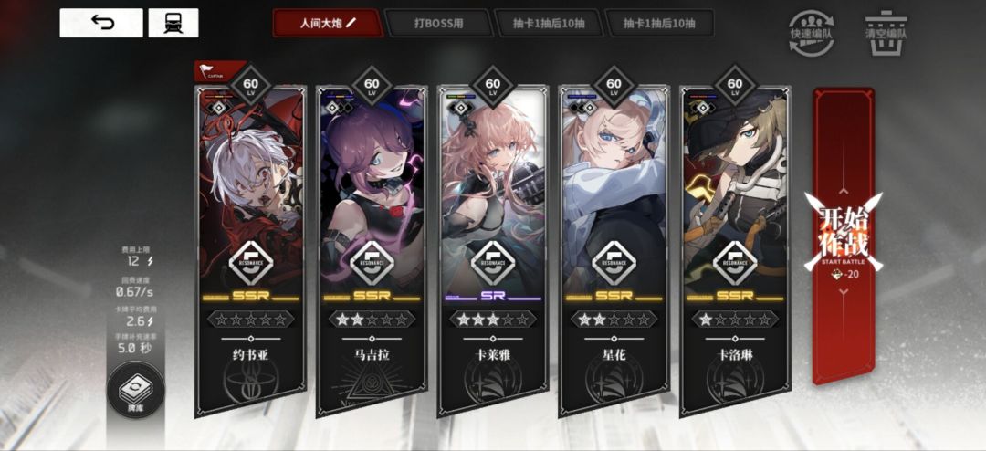 我看很少人写这个队伍攻略,我个人体验下来是比较好的,所以介绍一下 1首先队伍刚需奶茶姐2命,没有的话可以不用看了,本队伍成本较高,但是上限也很高。 2.队伍组成,那由他,苍叶,里奈,奶茶姐,星花。 3.星花为过牌手和叠攻位,本队伍无法自动,请注意 无法自动,无法自动,重要的事说三遍。 4.手法上主要靠苍叶的十费卡丢弃会给五费用,那由他黄卡丢弃会给3张牌,蓝卡会给一张减伤卡。手上必须留着十费卡和那由