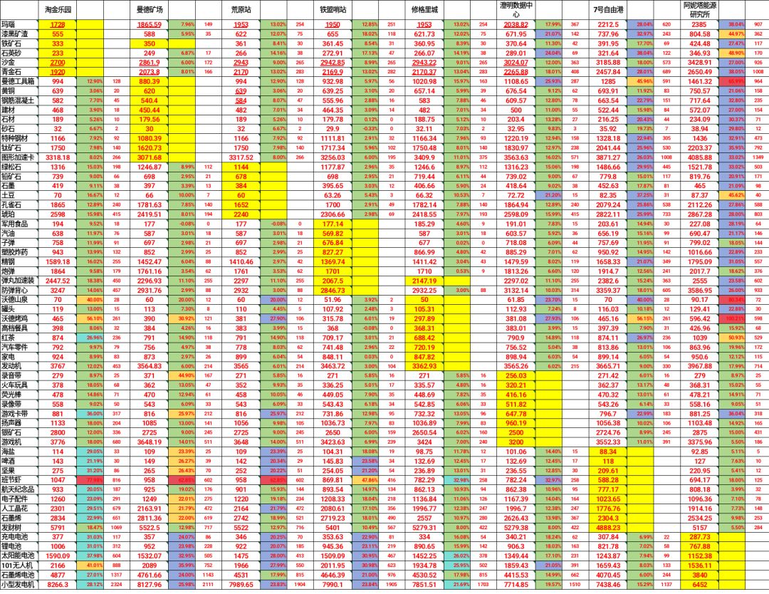 补齐了缺失的数据…… b站wiki有实时的表,感觉那个实用多了,所以大概这是最后一版了(前两天才看到那个,所以我爆亏好多体力)[表情_吃瓜] 计算的市场原价(100%波动) 已经确定市场原价是不会变动的 黄色是本地商品 绿色是0-20利润,可能跑亏 蓝色20-40,跑,赚多赚少 橘色40-60,跑,赚多和赚特多 红色60+,高买低卖也能跑 做了一个方便自己用的图…… 使用方法是每天登游戏做商会任务